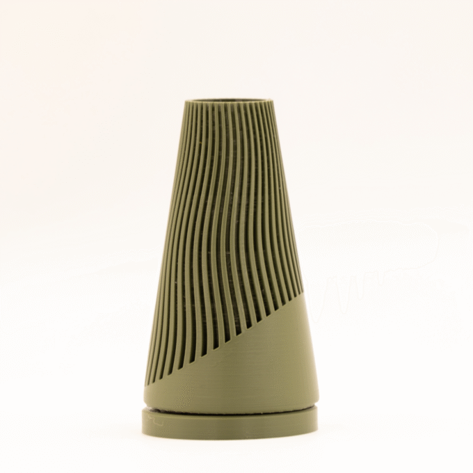 Modern çizgilere sahip, dayanıklı PLA+ malzeme ile üretilmiş 3D baskı vazo. Estetik ve zamansız bir dekor objesi.
